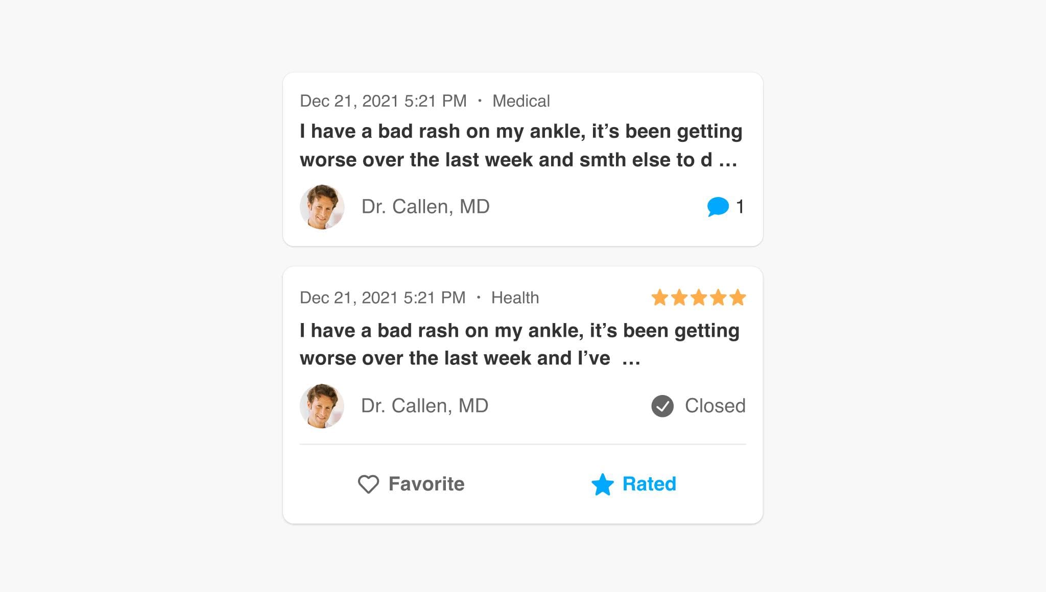 Cards were redesigned to surface the most relevant information at a glance: question category, timestamp, expert name and rating, conversation status, expert reply preview, and quick actions (Favorite, Rate).