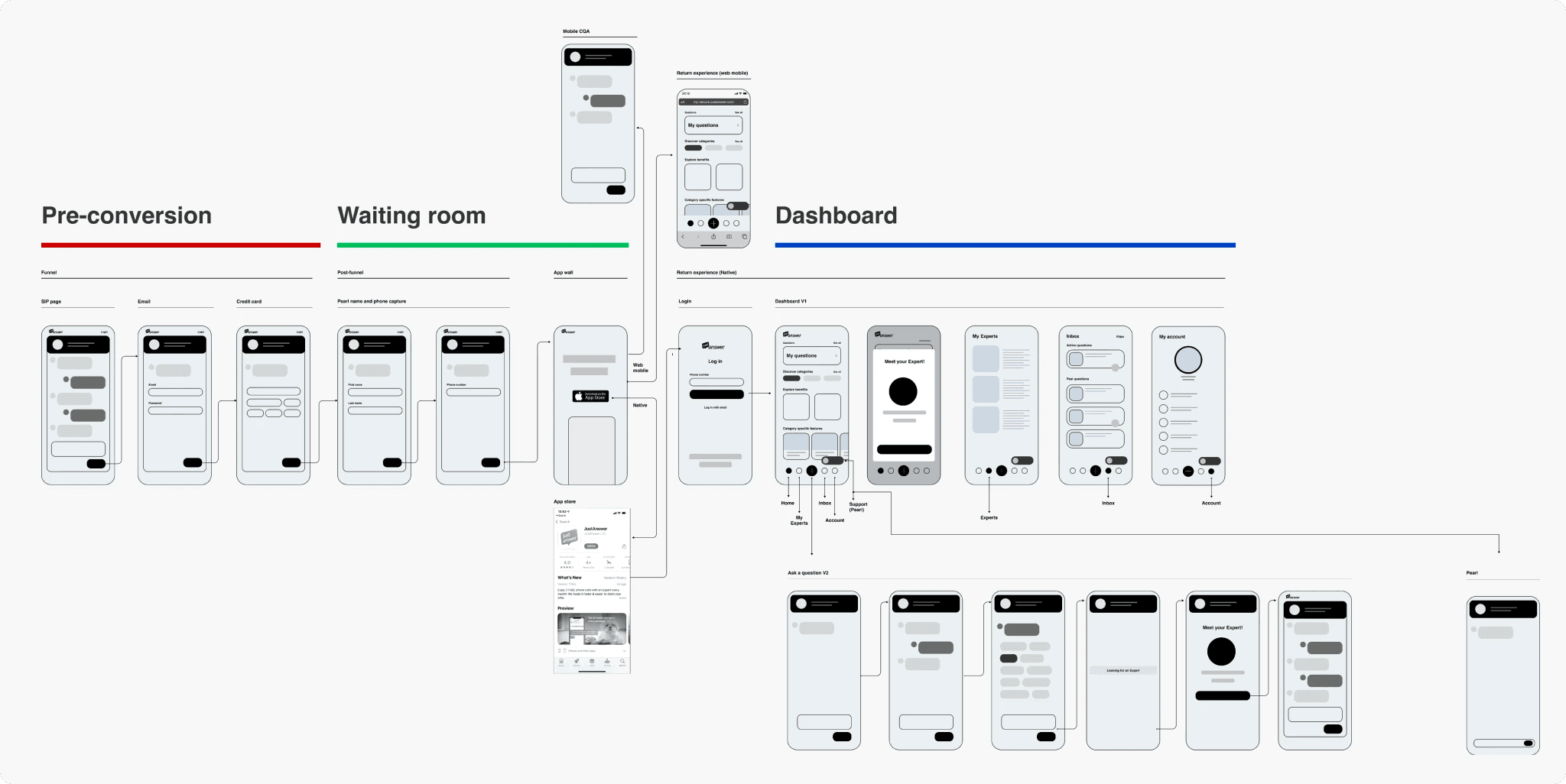 Our product had three distinct phases: Pre-conversion, Waiting room, and the customer Dashboard. This project focused exclusively on the dashboard — the experience after a user had already signed up and asked a question.