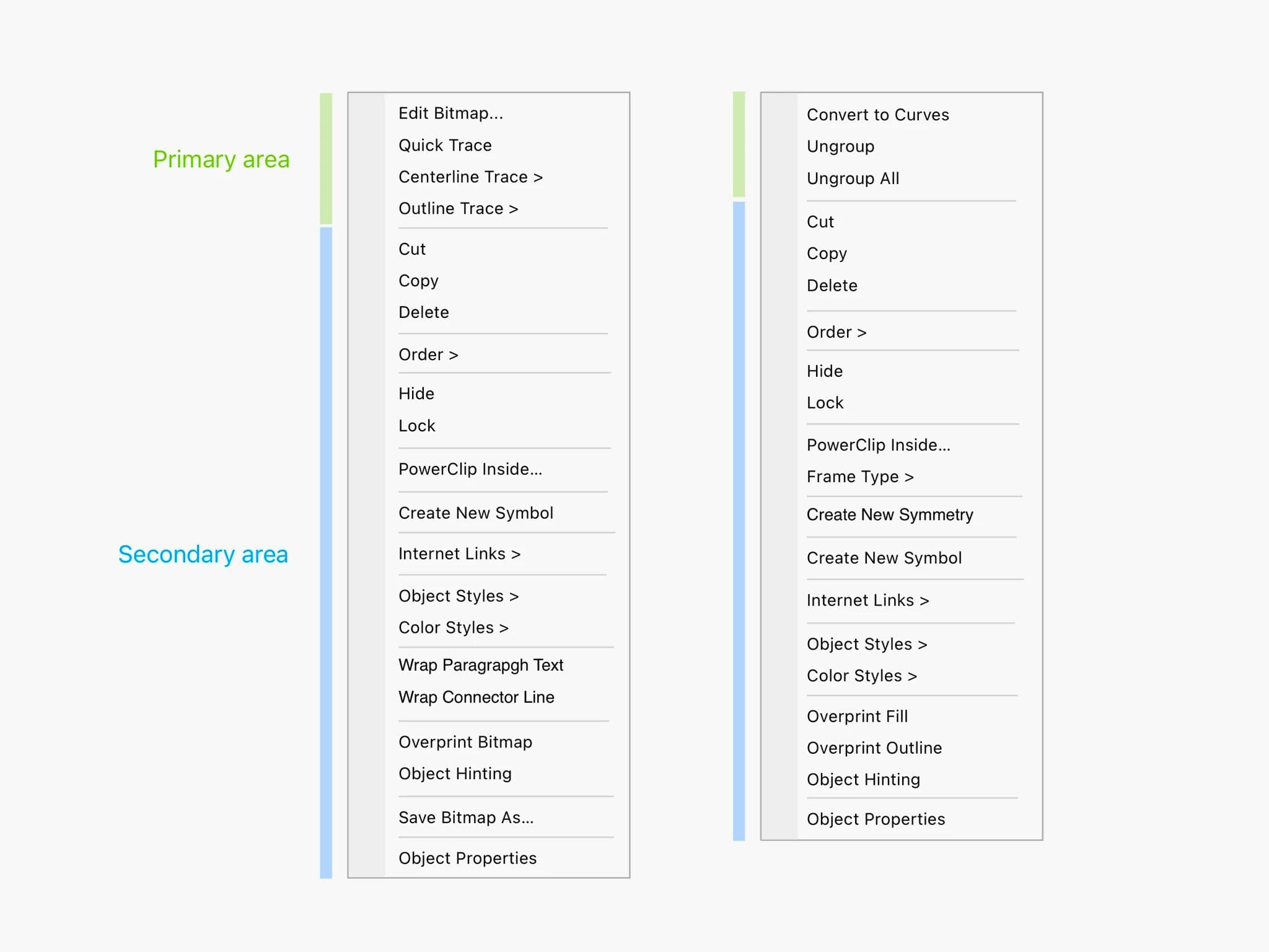 I established a clear information architecture rule: the menu structure should reflect the selected object. Every menu was divided into two zones — a Primary area for object-specific actions, and a Secondary area for shared, non-object-specific actions. This created consistency across all menus and reduced development effort.