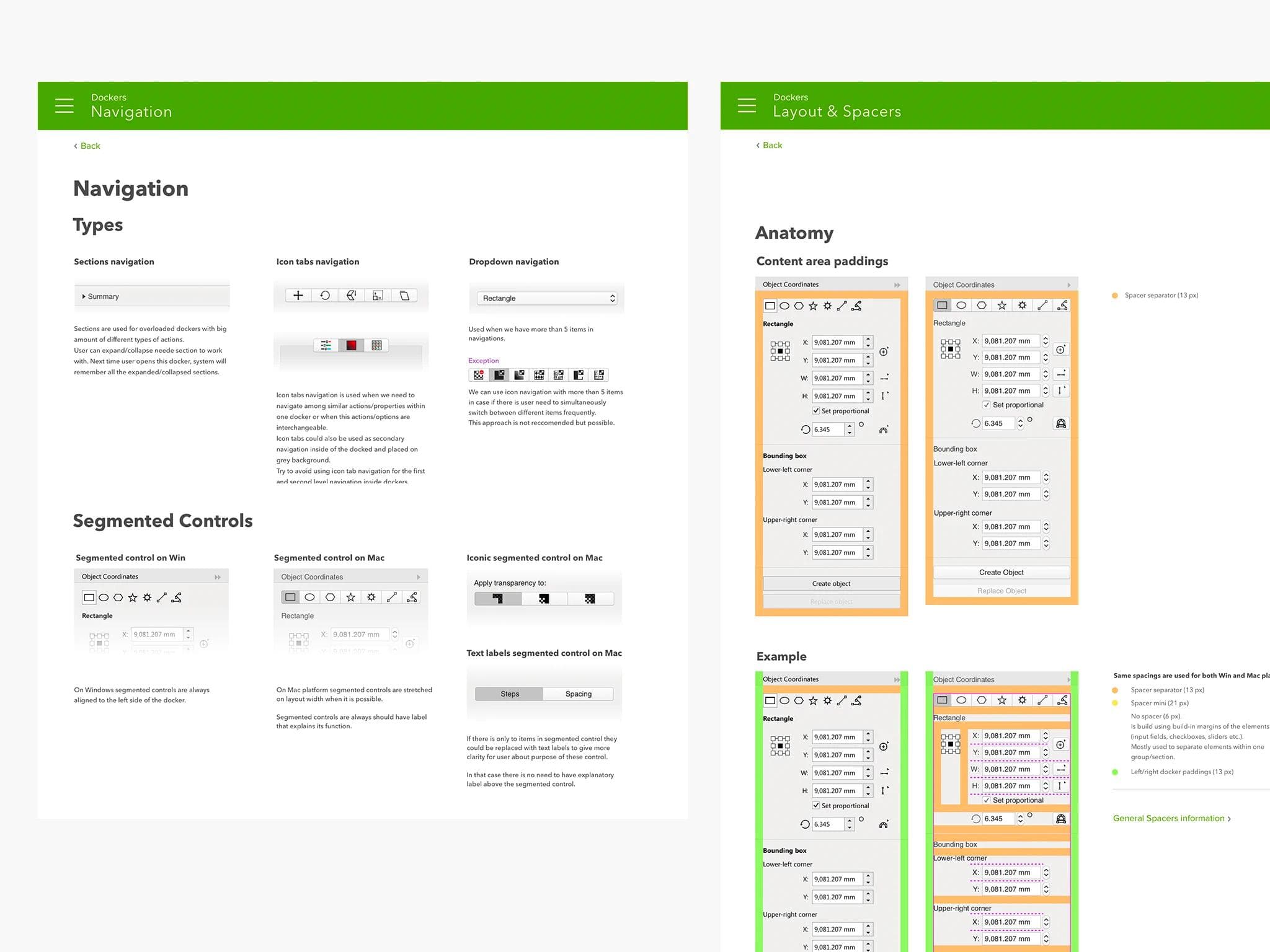 Dockers are contextual panels on the right side of the interface that give users access to object controls and parameters — similar to panels in Photoshop or Illustrator.