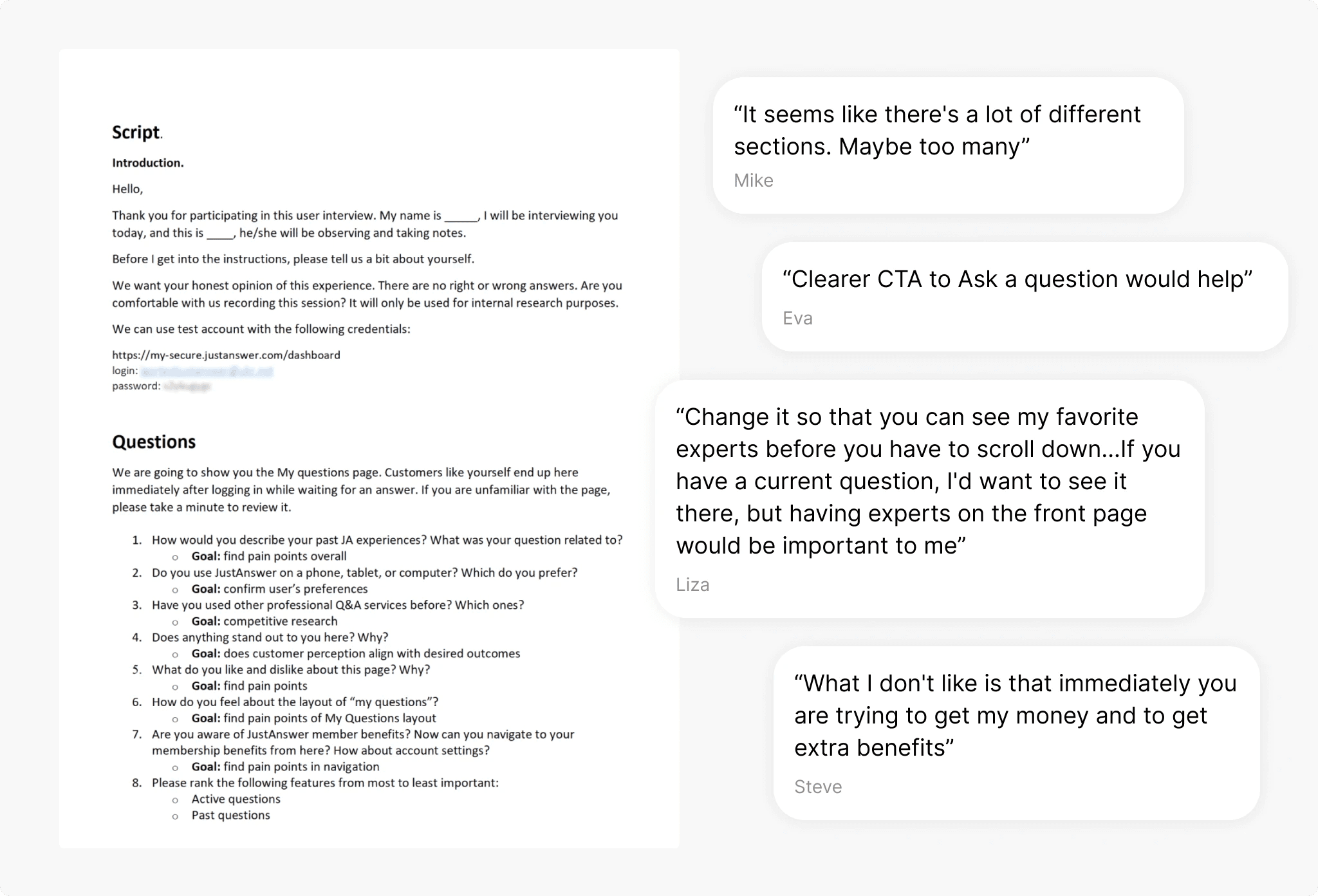 User interviews: Active customers who had submitted at least 2 questions in the past 3 months were given access to a test account and asked to navigate freely while thinking aloud.