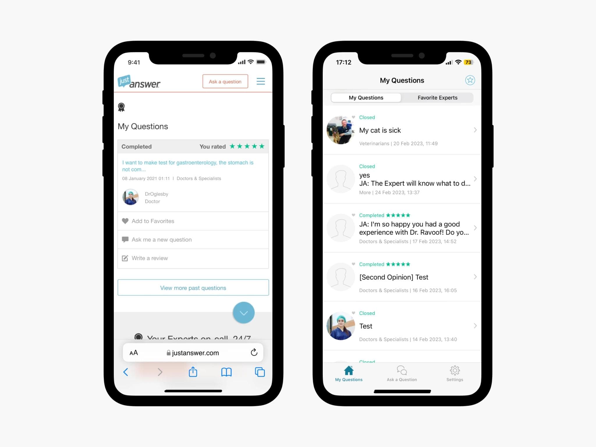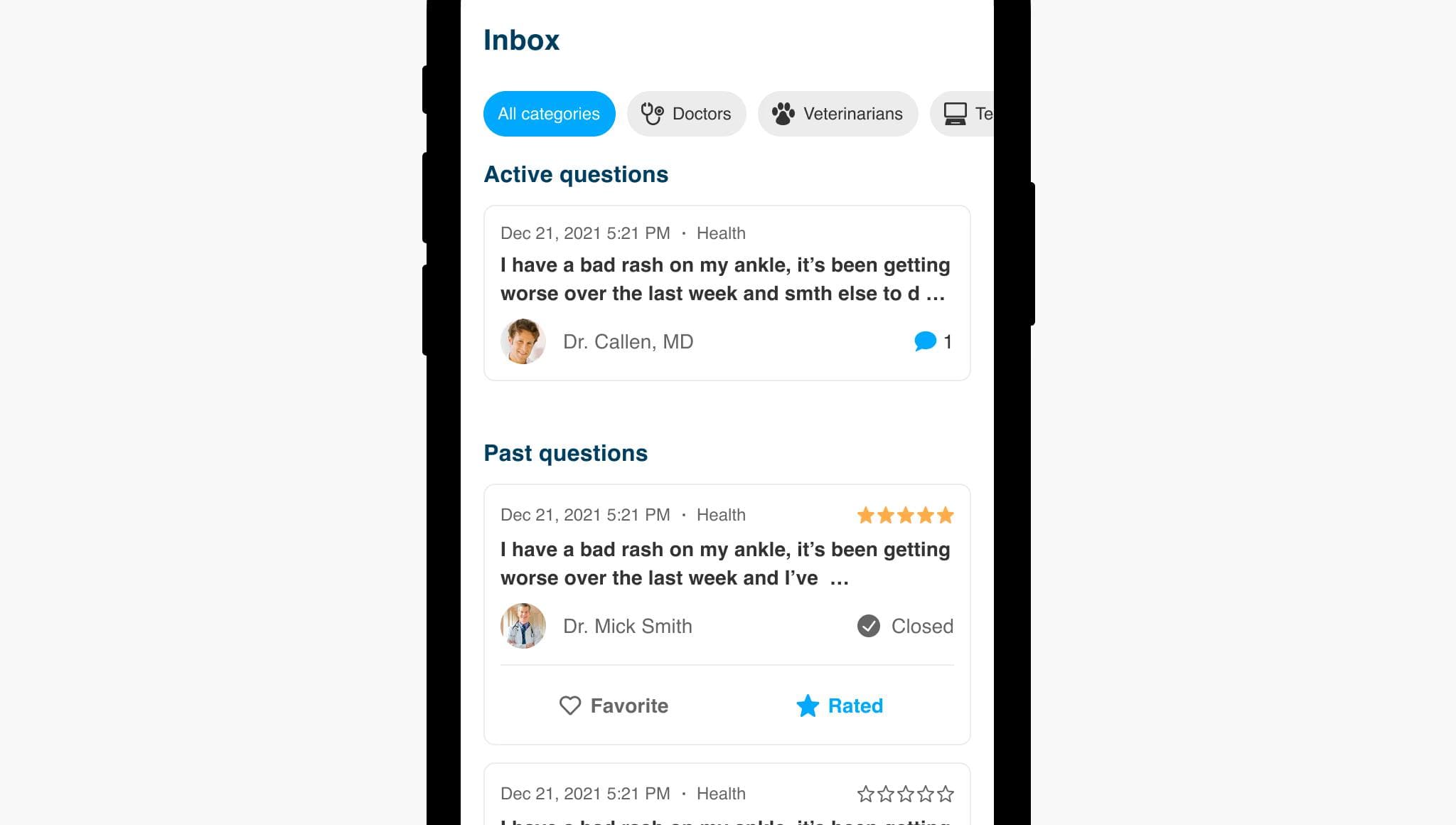 Cards were redesigned to surface the most relevant information at a glance: question category, timestamp, expert name and rating, conversation status, expert reply preview, and quick actions (Favorite, Rate).